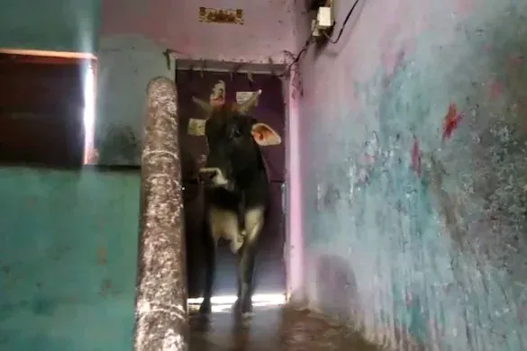 स्थानीय लोगों ने बताया कि एक सांड सीढ़ियों के सहारे छत पर चढ़ गया है. सांड को नीचे उतारने की कोशिश की तो वह नीचे आने की बजाय तीसरी मंजिल तक पहुंच गया. कड़ी मशक्कत के बाद उसे नीचे उतारने की कोशिश की जा रही है, लेकिन सांड दरवाजे पर ही खड़ा है. मोहल्ले के लोगों ने इसकी सूचना नगर निगम को दी, लेकिन अभी कैटल कैचिंग दस्ता मौके पर नहीं पहुंचा है. तीन मंजिला भवन की सीढ़ियों के जरिए सांड के पहुंचने से इलाके में हड़कंप मचा हुआ है.