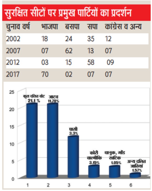 पिछली बार सर्वाधिक आरक्षित सीटों पर कब्जा जमाने वाली भाजपा एक बार फिर सत्ता में वापसी के लिए कई बड़े दलित नेताओं को महत्व देने के साथ ही दलितों के लिए तमाम कल्याणकारी योजनाएं चला रही है। लोक-लुभावनी योजनाओं की झड़ी लगाकर भाजपा दलित वोटरों में और गहरी सेंध लगाना चाहती है। वर्ष 2012 में सर्वाधिक आरक्षित सीटों पर कब्जा जमाकर सत्ता हासिल करने वाली समाजवादी पार्टी भी एक बार फिर अनुसूचित जाति की ज्यादा से च्यादा सीटों को हासिल करने के लिए कोई कसर नहीं छोडऩा चाहती। खिसकते जनाधार को थामने के लिए बसपा भी पूरी ताकत से लगी है ताकि डेढ़ दशक बाद पांचवी बार सत्ता हासिल करने में कामयाब हो सके। कांग्रेस नए सिरे से दलितों में पैठ बनाने के लिए हाथ-पैर मार रही है।